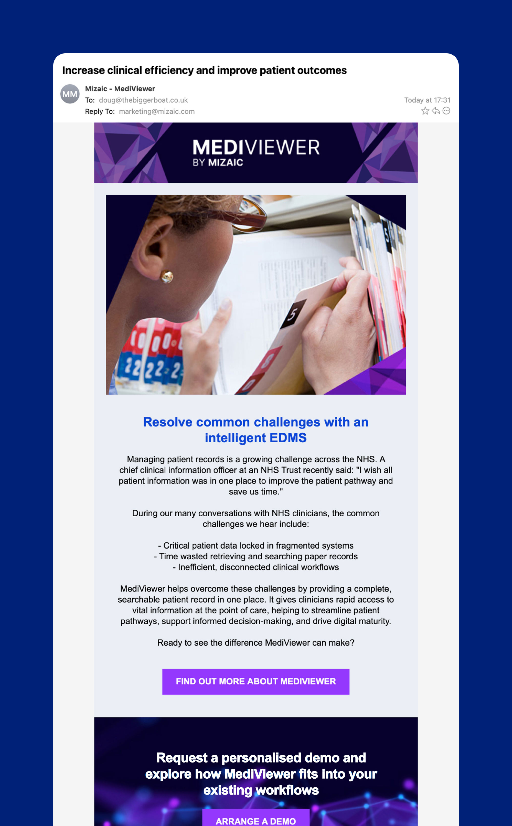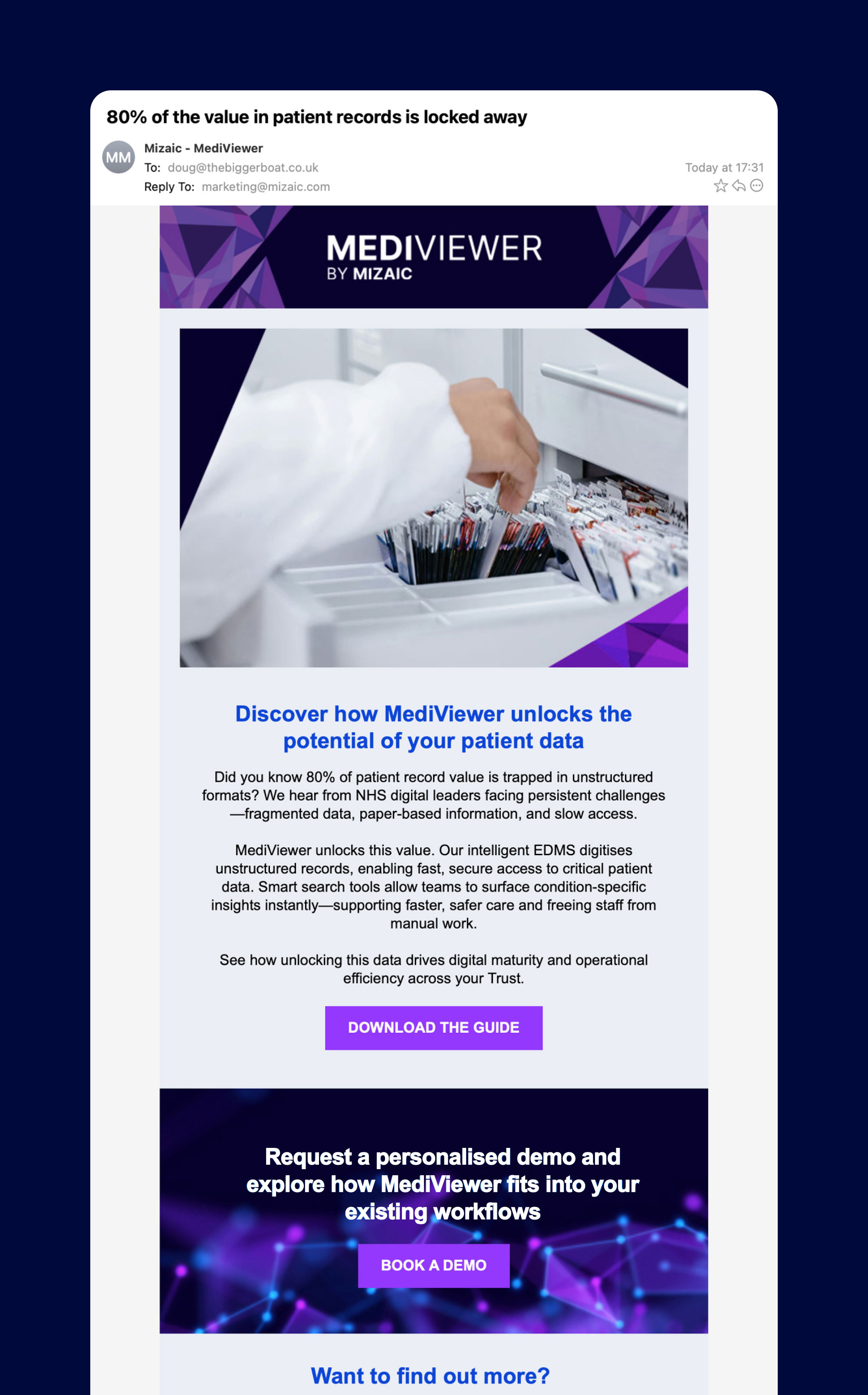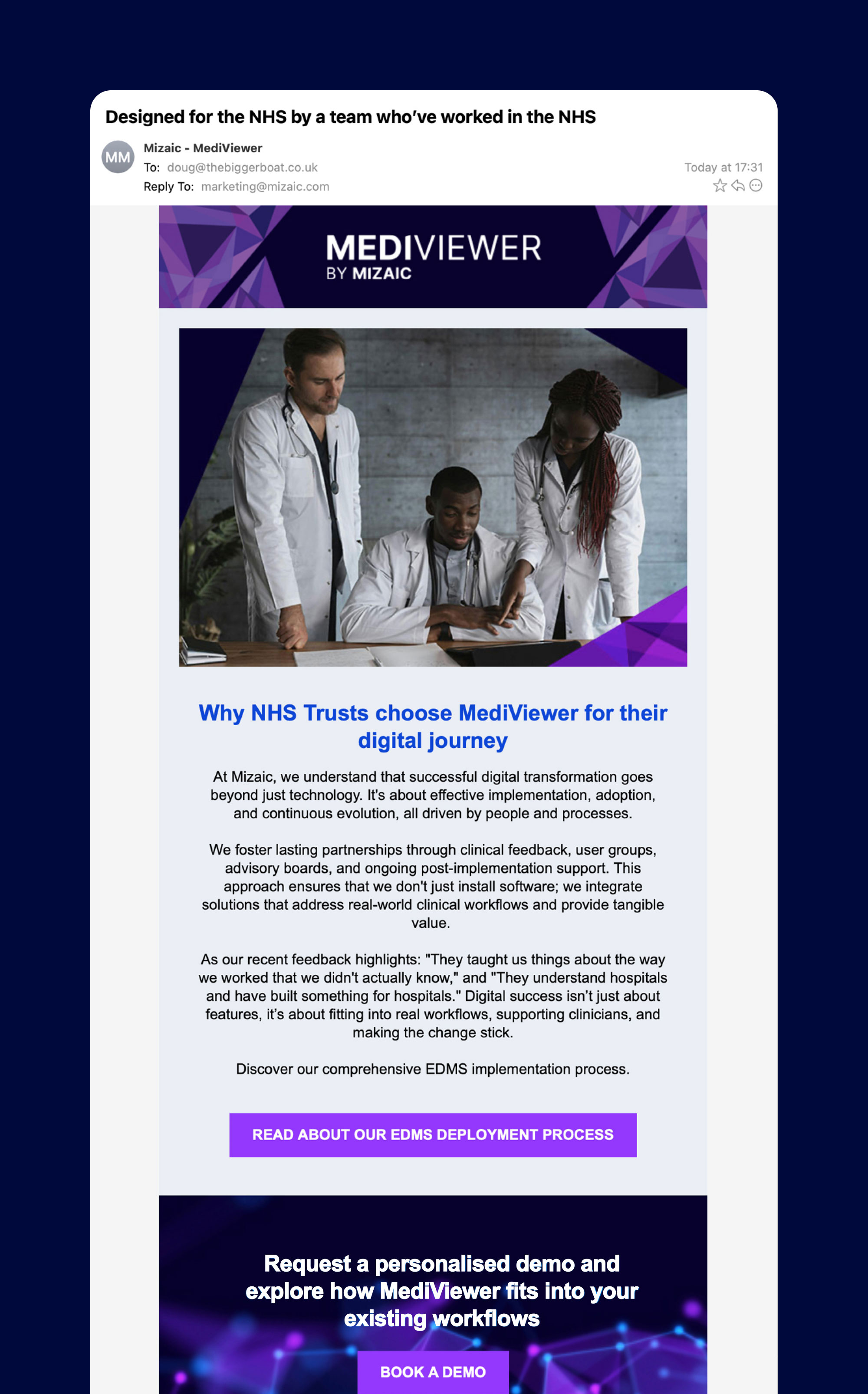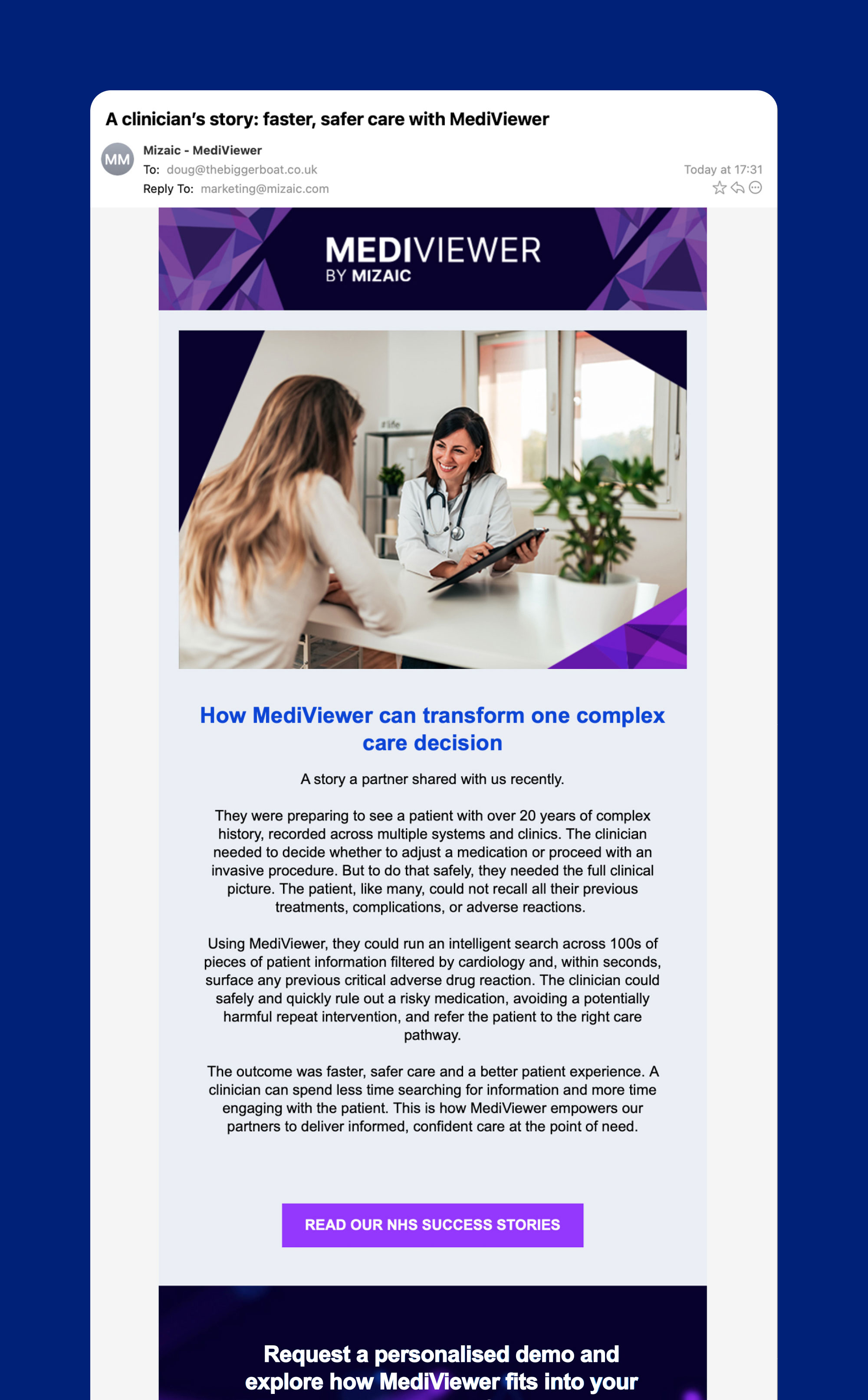 This persona-led approach ensured messaging resonated with clinicians’ practical needs, helping them to see the value of Mizaic’s technology in everyday clinical scenarios.