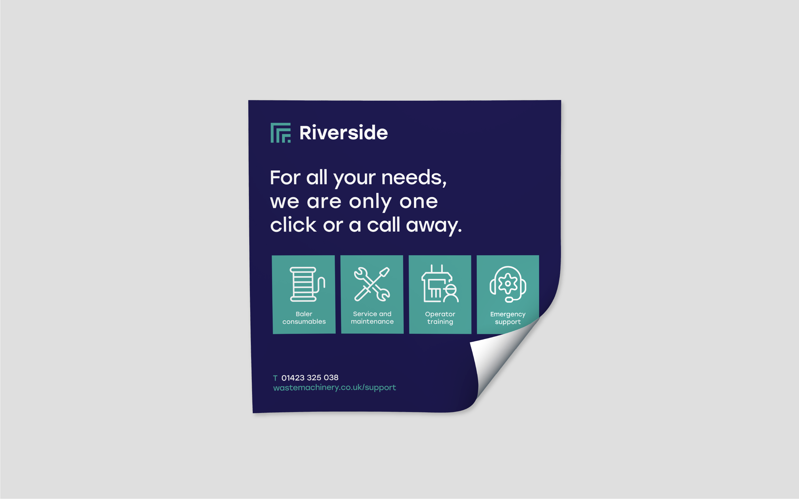 We completely modernised Riverside’s brand identity, first by dropping the wordy full limited company name and switching to simply Riverside. We also moved away from the traditional ‘recycling green’ colour palette to a more corporate and confident alternative that stands out in the market, while introducing a graphic device to represent the baling side of the business and give creative flexibility across marketing collateral. All brand materials were updated to ensure a consistent, modern, and professional look and feel.